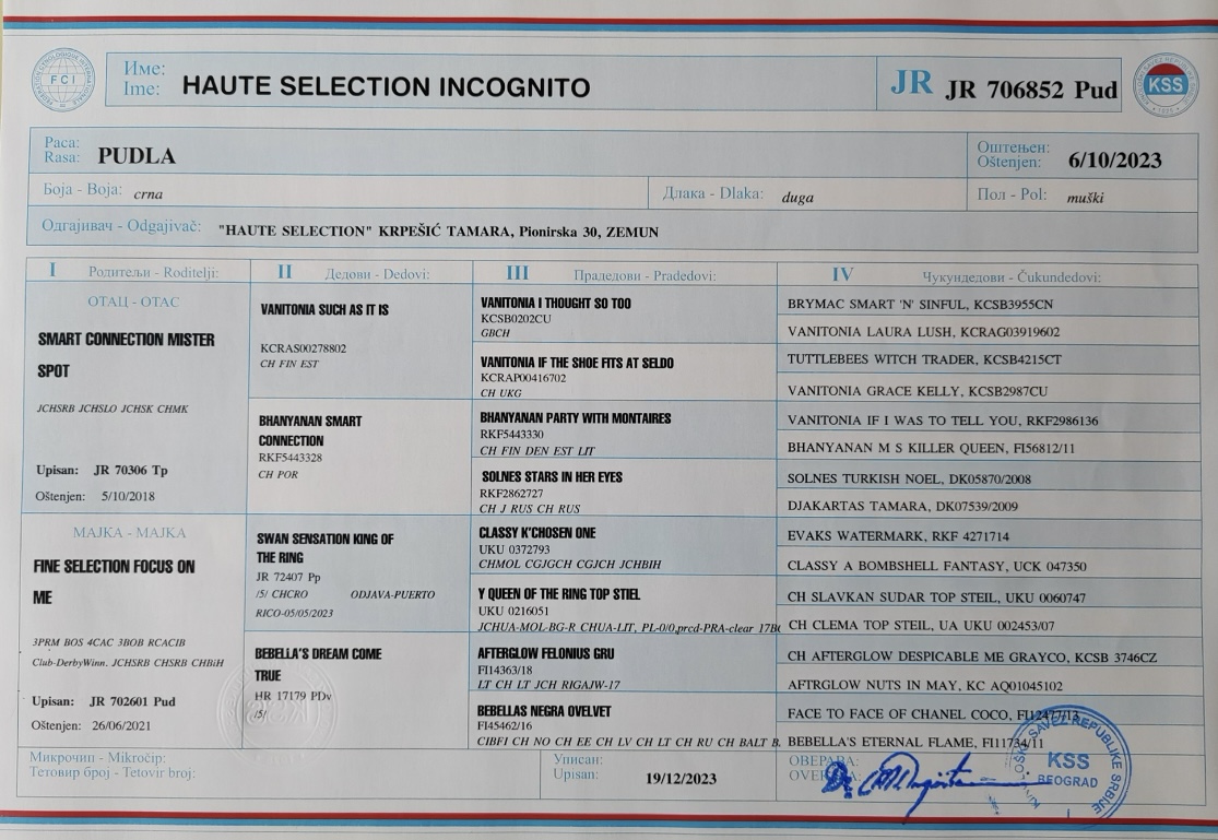 Khan har vi kjøpt inn av flere grunner. Han har en stamtavle som er veldig ulik den vi har på våre andre hunder, samt at han har et fantastisk temperament, så trygg og glad. I tilegg har han vært gjennom nødvendige helsetester for avl og han har ikke en eneste anmerkning. Stamtavlen til Khan på farsiden består nesten bare toypudler, mens på morsiden består den mest av dvergpudler. Khan er en godt bygget hannhund, med vakkert hode og uttrykk, kort sterk rygg, fine bevegelser og en fantastisk tykk pels. Vi gleder oss til å se hva han gir videre i sine avkom.